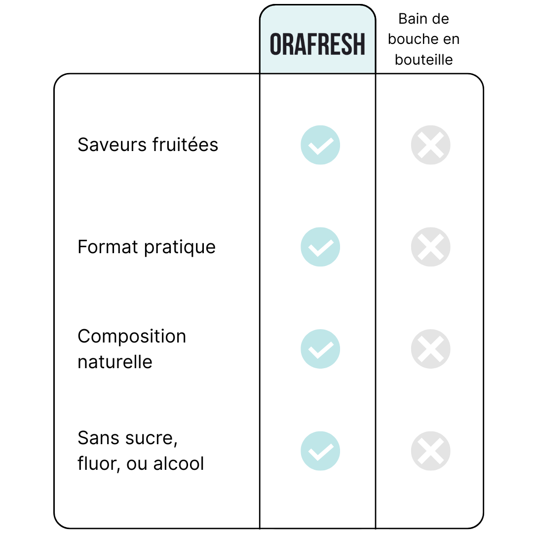 Orafresh aide à garder une haleine fraîche, à protéger la bouche au quotidien, et s’utilise partout, sans contrainte.