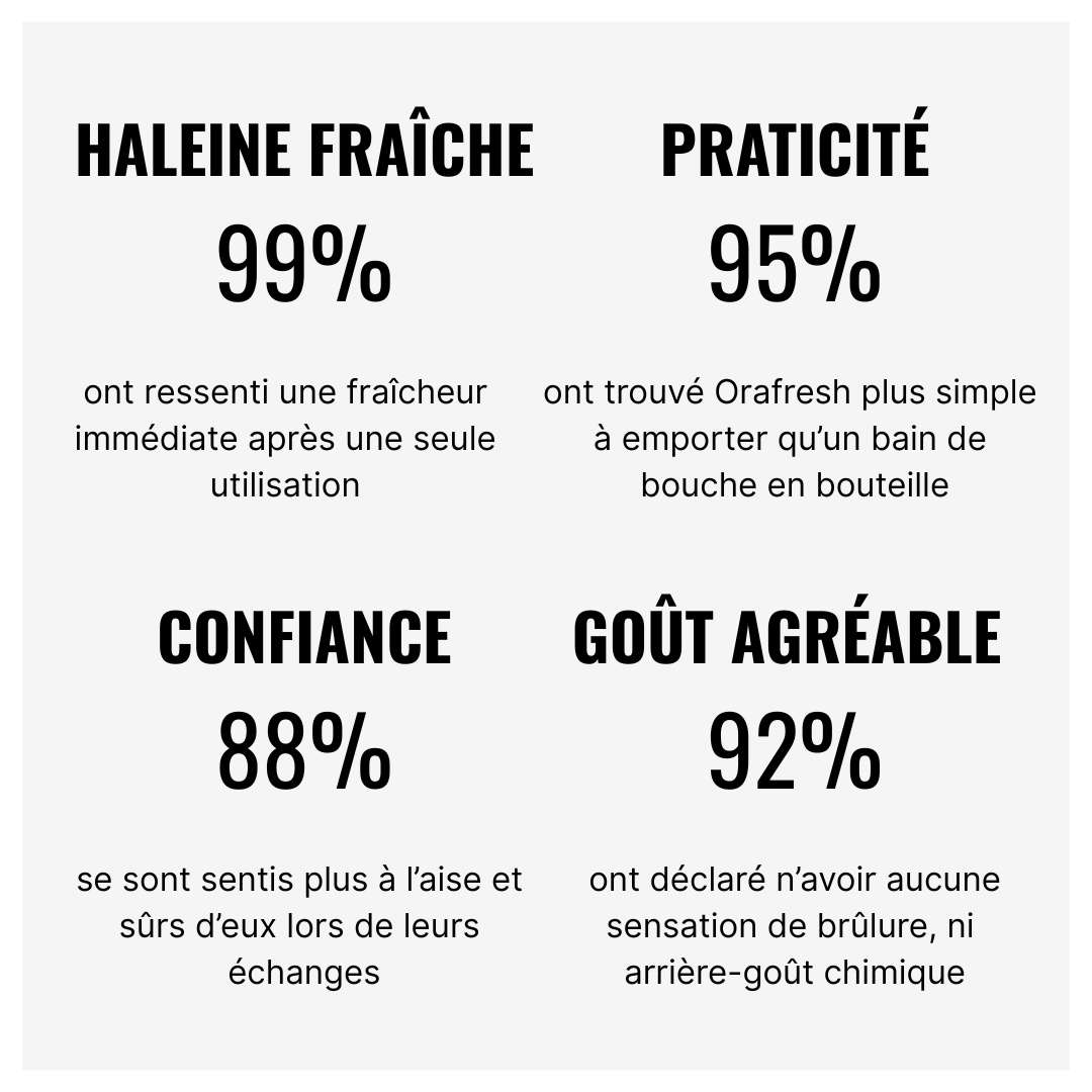 Après un repas, en déplacement, au travail, avant un rendez-vous ou simplement pour une sensation de fraîcheur immédiate. Orafresh s’adapte à tous les moments de la journée.